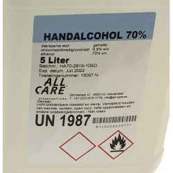 Bestaat uit 70% Ethanol (v/v) en een terugvetter ter voorkoming van huiduitdroging. Handalcohol 70%, voor vulling van uw dispenser. Wordt geleverd per can van 5 liter.